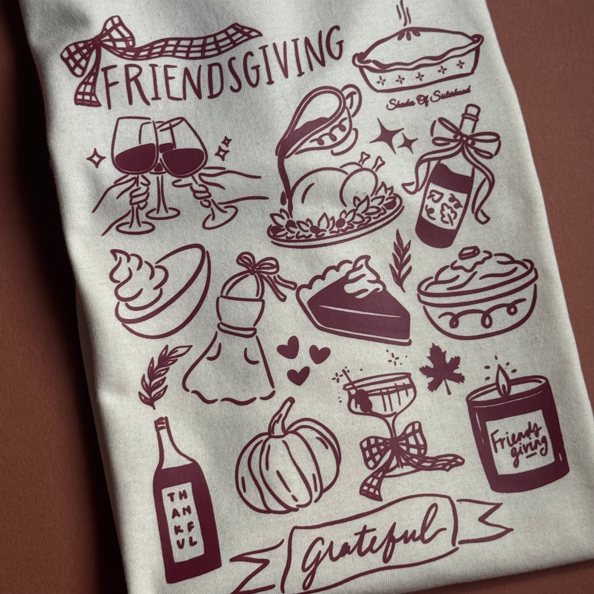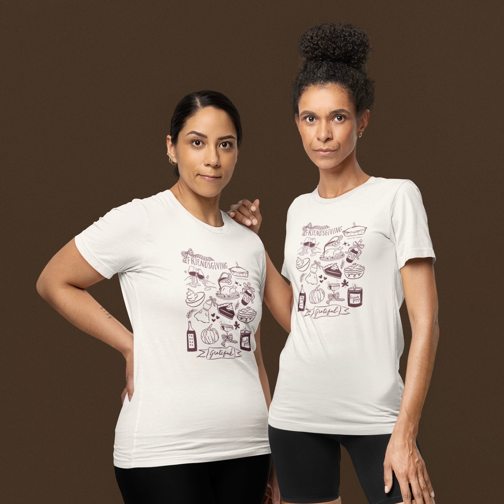 Limited Edition Holiday Exclusive Friendsgiving doodle drawings in maroon on a comfortable (unisex) natural tan t-shirt. - Unisex fit, we suggest sizing down for a tighter fit.