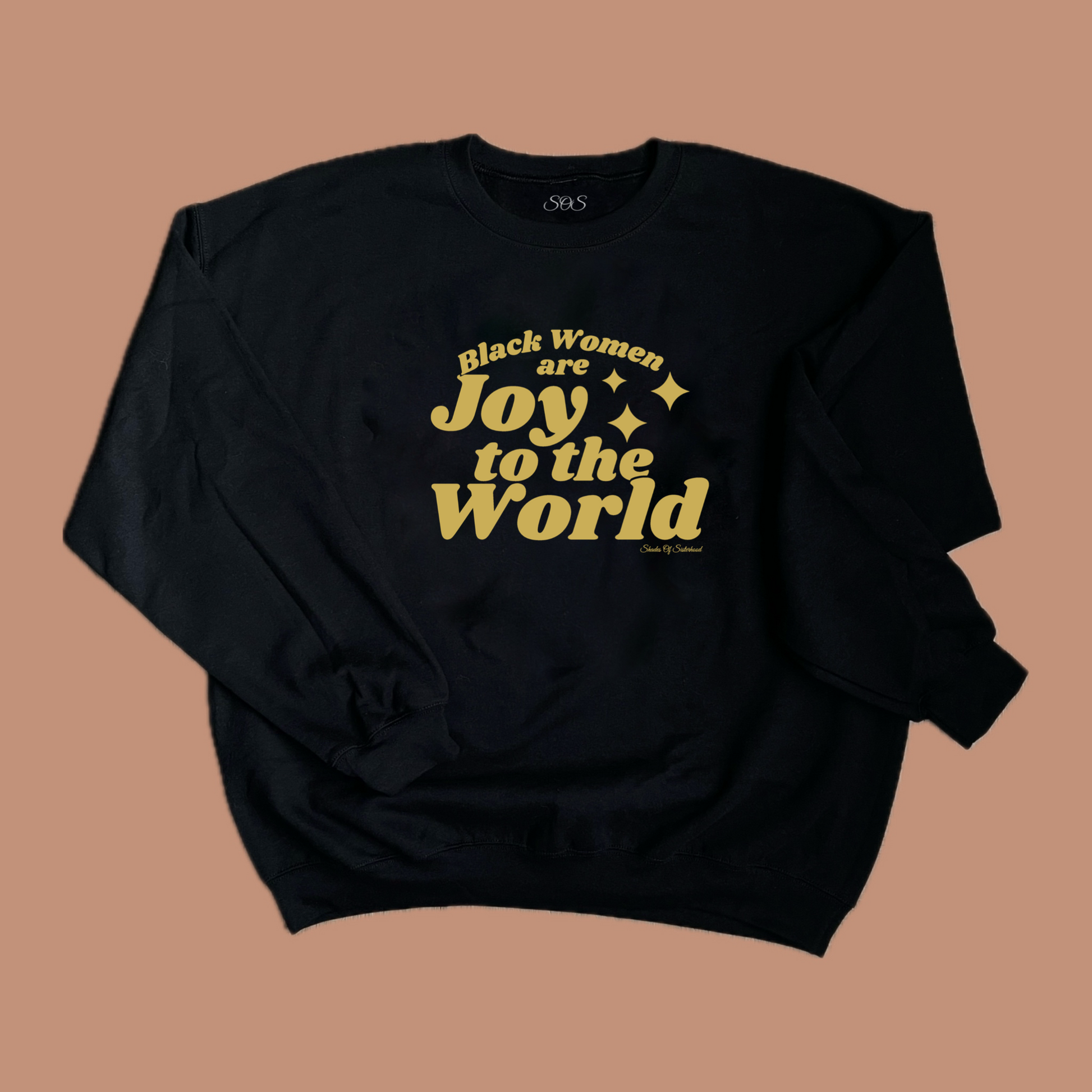 Our exclusive “Black Women Are Joy To The World” design in metallic gold on a black oversized (unisex) crewneck sweatshirt. - Unisex fit, we suggest sizing down for a tighter fit.